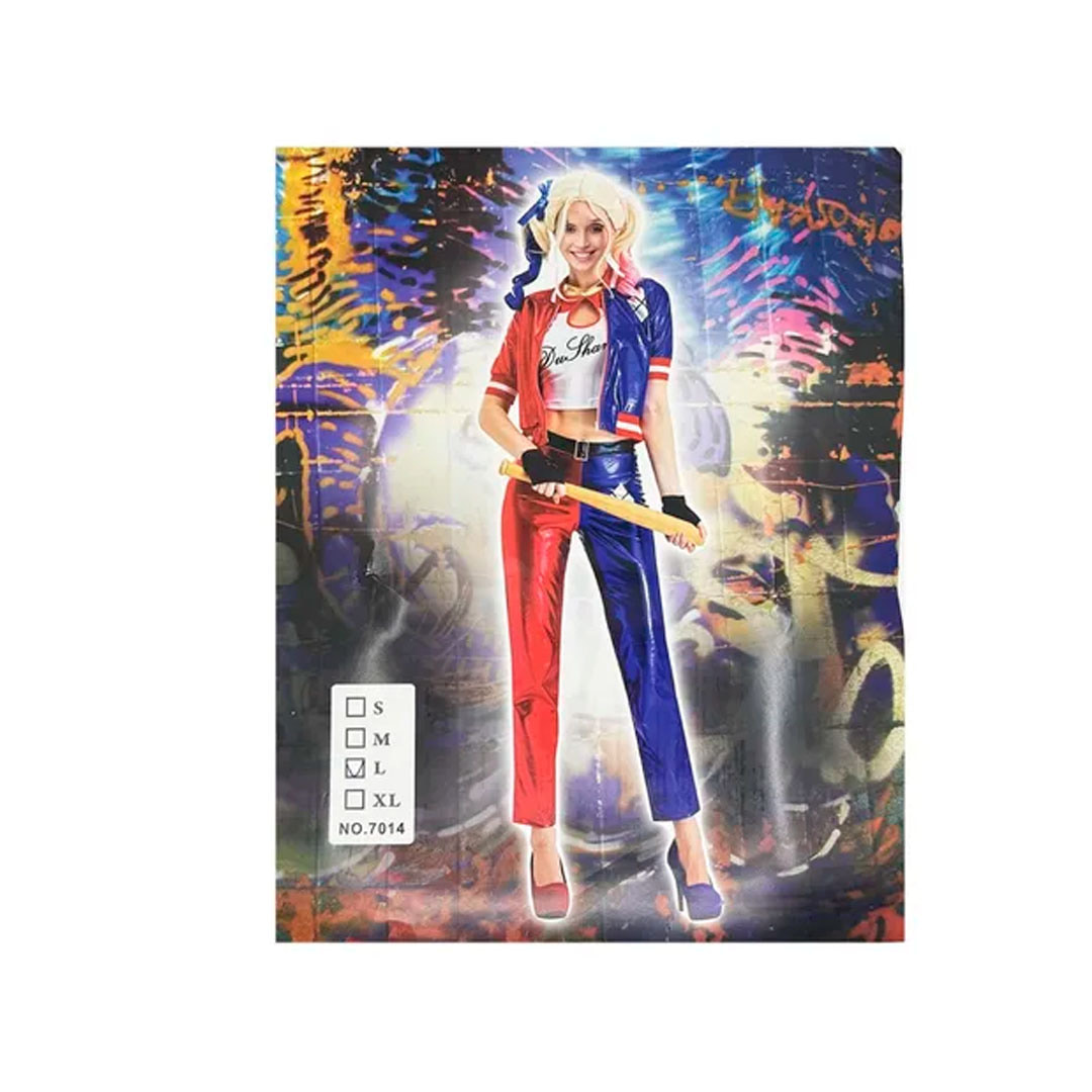 Disfraz para adulto inspirado en Harley Quinn, incluye conjunto rojo y azul con detalles icónicos. Ideal para destacar en fiestas de Halloween con un look rebelde y llamativo.